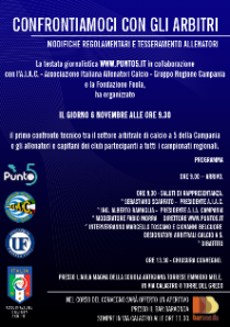 Lodevole iniziativa del portale Punto 5.it che ha organizzato per domenica un convegno con gli arbitri. Ecco il comunicato ufficiale. “Lo abbiamo promesso e lo abbiamo fatto. Il convegno giornalistico sulle modifiche regolamentari ai play off con il Comitato Regionale Campano ha smosso un po’ le acque e un piccolo passo in avanti c’è stato. Troppo poco, ma solo con la continuità si ottengono i risultati. La nostra testata giornalistica ha messo sul piatto della bilancia un solo modo di agire, quello di essere amplificatrice della voce dei club. Il dissenso forte, costante, sulla qualità delle direzioni di gara ci ha spinto ad organizzare un altro appuntamento di straordinaria importanza, un confronto su quelle problematiche che evidenziano spesso le immagini trasmesse da Punto 5 attraverso gli highlights di tantissime gare a livello regionale. La disponsibilità dell’ing. Antonio Ramaglia, presidente A.I.A. Campania, la collaborazione dell’A.I.A.C. ci ha consentito di ideare una giornata in cui tutte queste tematiche verranno affrontate in un dibattito aperto che riguarderà esclusivamente il settore tecnico. Sono invitati a partecipare infatti gli allenatori e i capitani delle società partecipanti a tutti i campionati regionali di calcio a 5.