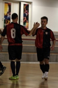 I Falchetti superano indenni questainsidiosa trasferta. Erano assenti Pignatelli e Pizzella. Allegretti con un poker (sette gol in due partite) proietta i suoi a ridosso della zona promozione. Al 3’ Allegretti si libera di un paio di avversari e con un siluro gonfia la rete (0-1). Gli arancioni di casa provano a reagire ma la retroguardia rossoblù e attenta. Nel frattempo i Falchetti sciupano un paio di occasioni, entrambi con D’Abrosca. Qualche minuto più tardi, D’Abrosca lungo la linea di fondo serve un ottimo assist ad Allegretti che sotto porta non sbaglia (0-2). La partita è saldamente nelle mani dei rapaci che continuano a divorarsi gol clamorosi. Vitelli colpisce il palo pieno con un tiro dalla distanza. Dagli sviluppi di un calcio piazzato dormita generale dei rossoblù che lasciano calciare indisturbato De Mattia a botta sicura (1-2). Intanto i Falchetti non ne azzeccano una, sbagliano anche passaggi semplici. In chiusura di tempo, fiammata rossoblu, Giacomini lascia partire una fucilata che il portiere respinge sui piedi di Allegretti il quale deposita in rete con un tiro in diagonale (1-3). Nella ripresa, Allegretti infila ancora la retroguardia arancione (1-4). La reazione avversaria è immediata, il palo salva i Falchetti. I ragazzi sciupano banalmente un paio di ripartenze. Giacomini si presenta solo davanti al portiere che lo trafigge con la palla, che passa tra le gambe (1-5). Il discorso ormai sembra chiuso, invece una disattenzione della difesa consente a Munini di accorciare le distanze in modo fortunoso (2-5). A 5’ dalla fine i Falchetti effettuano alcune sostituzioni azzardate che favoriscono il ritorno degli avversari. Infatti, i locali prima colpiscono il palo e qualche minuto dopo, vanno a segno con Brocca (3-5). I rossoblù non sono più tranquilli, è ancora il palo a salvarli. Al 38’ Brocca con una puntatona dal limite riapre il discorso (4-5). Nel frattempo gli arancioni di casa hanno esaurito il bonus falli. Al 39’ brividi per i Falchetti, un batti e ribatti in area viene sbrogliato dall’estremo rossoblù, che subisce anche fallo facendo guadagnare tempo e tiro libero ai suoi. E’ l’ultima azione, calcia D’Abrosca che fallisce colpendo la traversa a portiere battuto. Per fortuna non c’è più tempo, gli arbitri mandano tutti sotto la doccia. I rossoblù devono meditare sui tanti errori commessi questa sera, perchè negli ultimi cinque minuti si stavano facendo sfuggire di mano un’importante vittoria.