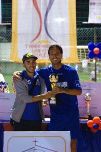 Subito dopo c’è stata la finalissima categoria Senior. Grande spettacolo organizzato dagli organizzatori con un’entrata in campo delle due squadre in stile NBA, molto scenografica ed emozionante. In maglia blu il team Art Moda, con in campo vari protagonisti della scorsa manifestazione da loro vinta; in maglia bianca la squadra del presidente Ciorra che ha vestito i panni della sfidante. A differenza della scorsa partita i campioni in carica sono partiti subito con il piede sull’acceleratore e dopo tre giri di lancette erano già in vantaggio grazie al gran bel diagonale mancino di Silao Forte. Risposta dei bianchi nel destro potente di Alfieri che si è stampato sull’incrocio dei pali, prima che anche Forte fosse fermato dal montante dopo una percussione personale straordinaria. Primo tempo proseguito nel segno dell’equilibrio fino al 24’ minuto quando Dino Fava è salito in cattedra realizzando il raddoppio. Nemmeno il tempo di mettere la palla al centro ed è arrivata la rete che ha dimezzato lo svantaggio dei bianchi, grazie ad un diagonale di Alfieri deviato da un difensore, proprio sul finire della prima frazione.