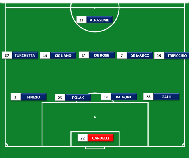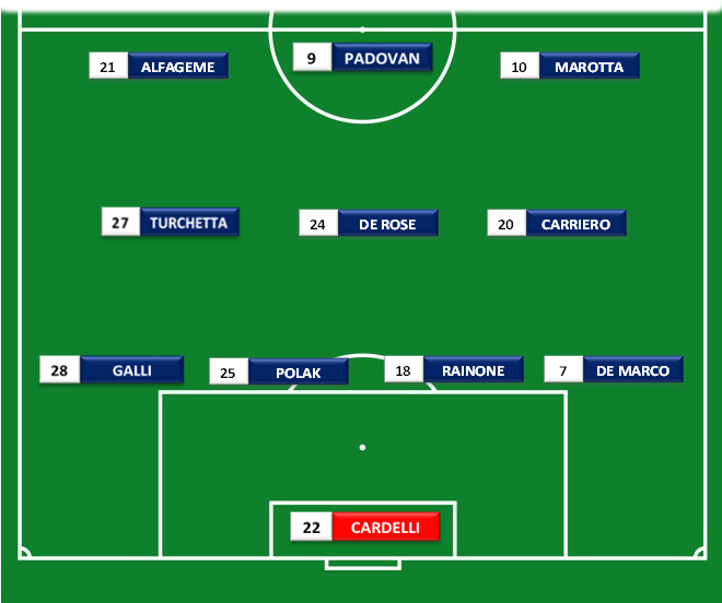 Il primo tempo termina con una Casertana sottotono e con l’Andria in vantaggio per 1 a 0. La ripresa comincia con i falchetti all’attacco. Dopo 5 minuti Padovan, dopo aver rubato palla sulla trequarti, si presenta davanti a Maurantonio che è bravo a chiudergli lo specchio della porta. Scazzola decide che è il momento di dare maggiore vivacità alla squadra e più peso offensivo. Fuori un opaco Rajcic e dentro Turchetta (Fig. 3).