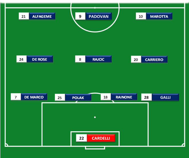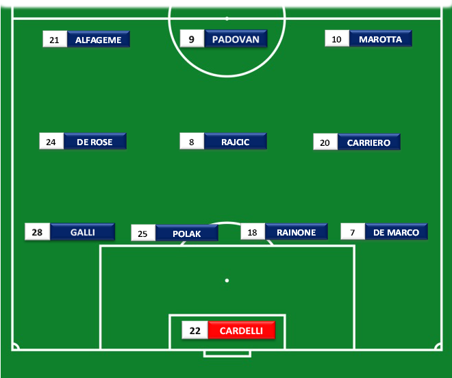 Dopo aver subito la rete di Barisic, Scazzola, per frenare Lattanzio, sposta Galli a sinistra e De Marco prende la posizione che era di Galli (Fig. 2)