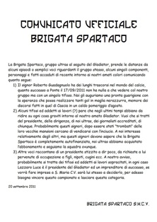 La Brigata Spartaco, gruppo ultras al seguito del Gladiator, prende le distanze da alcuni episodi o semplici voci riguardanti il gruppo stesso, alcuni singoli componenti, personaggi e fatti accaduti di recente intorno ai nostri amati colori, comunicando quando segue: