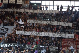 E poi lì, stipati nel loro spazio, ecco i diavoli. Lo scorso anno abbiamo assistito ad ampi e preoccupanti vuoti nella curva Ancilotto. Sul finire della scorsa stagione, ammirare quella magica curva faceva venire tristezza per quei vuoi che la circondavano. Abbiamo pensato che, anche la, la musica stava cambiando. Ed, invece, è tornato il ruggito. Il ruggito di ragazzi che si sobbarcheranno tutte le trasferte possibili (sempre se il CASMS non li bloccherà) pur di stare al fianco della squadra amata. I diavoli ci sono, si vedono, si sentono. Durante il riscaldamento è iniziata la loro partita; il primo striscione è stato dedicato al compianto Giovanni Maggiò: “Alla storia ci hai consegnato, con affetto vai ricordato. Ciao Cavaliere”. Applausi quando lo speaker Mercogliano ha ricordato a tutti lo scudetto vinto dal Des, per la terza volta di fila, nel softball. Curva scatenata, finalmente, ed ecco alzarsi il nuovo striscione: “Forza Caserta lotta con il cuore, i diavoli sono pronti, ti sosteranno con ardore”. Sinceramente un gran bel vedere in una polveriera che scalda il cuore e ti porta oltre ogni limite tecnico, tattico e fisico. Un incitamento costante e continuo per tutti i 40′ supportati, finalmente, anche dal resto del palazzetto che, vocalmente e ritmicamente con le mani, non ha smesso un secondo di seguire la curva. Un palazzetto tornato baluardo invalicabile di amore, passione e speranza. E’ la stagione di ‘lacrime e sangue’ come ho più volte detto. Chi pensa di venire al Palamaggiò a fare una passerella, oppure non entra con la voglia di dare una marcia in più a questi ragazzi, farebbe bene a restare a casa. Mai come quest’anno c’è bisogno dell’incitamento di tutti per tenere vivo il sogno bianconero. E, poi, come si fa a non volere bene a questi ragazzi? Il veterano Righetti che si butta sul parquet per sporcare un pallone, i muscoli ed il cuore immenso di Stipanovic (già idolo incontrastato della tifoseria), Collins e Fletcher che non perdono occasione per chiedere l’urlo del pubblico. E’ una Juve guerriera, forse il roster che veramente si addice a questa piazza. E’ solo il primo capitolo di questo viaggio: i voti sono alti per tutti. I diavoli hanno ripreso la loro marcia. Non si fermeranno mai anche in ricordo dei cinque ragazzi diffidati per i fatti di Brindisi. A loro è dedicata la nuova ‘pezza’ in curva Ancilotto: “Non si vedono ma ci sono”. Anche per loro bisogna alzare la voce, cantare, urlare, non smettere mai di incitare. Il sogno bianconero è ripartito. Caserta ha ripreso a far battere il suo cuore.