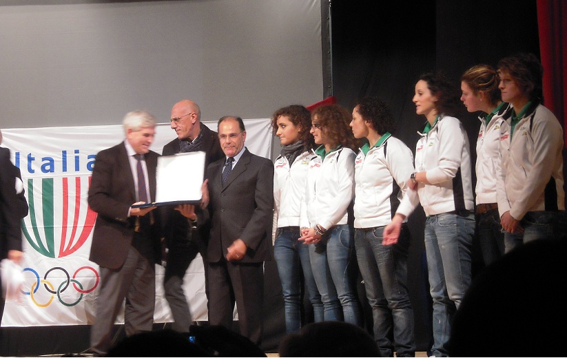Un premio speciale è andato al decano dei giornalisti sportivi ex ‘Il Mattino’ e ‘Corriere dello Sport stadio’ Franco Esposito, 5 Olimpiadi, 5 mondiali di calcio, poi tantissima boxe, ciclismo, nuoto e pallanuoto sulle spalle, premi vinti coi suioi libri sullo sport e adesso anche la scultura del Dio Volturno dell’artista Marello. Commosso, visibilmente, ha ricordato i ‘vecchi tempi’ con i convenuti ed ha ringraziato il CONI di Caserta per il premio. Così come ha fatto poco dopo la bellissima Rossella Verde, New Volley Gricignano e finalista di Miss Italia, nonché Miss Bellezza Sportiva Campania 2011. Lei, schiacciatrice 20enne del team atellano in Serie B2 si è augurata la promozione per la sua squadra. Per lei un prezioso manufatto in seta di San Leucio. Il gran finale è tutto dedicato ad Ennio Falco che olte alla scultura del Dio Volturno con tanto di riferimento ai 150 anni dell’Unità Italiana anche gli incoraggiamenti delle autorità e del pubblico del Ricciardi per la prossima avventura a 5 cerchi. Falco ha ringraziato promettendo battaglia. Nel mezzo gli intermezzi artistici ancora di Pasquale Tedesco e della scuola di danza Arabesque di Capua. E dopo quasi 3 ore tutti a casa, dopo le foto di rito.