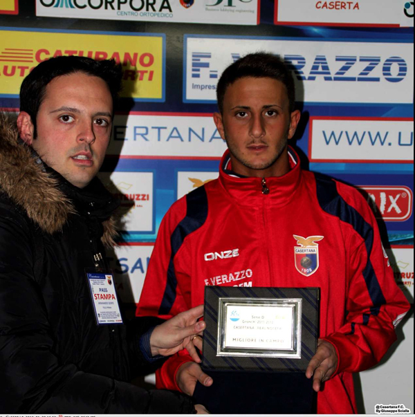 Andrea Magaddino è stato votato come migliore in campo della gara Casertana-Real Nocera. L’attaccante napoletano è stato premiato negli spogliatoi con una targa ricordo offerta dal nostro portale in collaborazione con Teleprima. Una iniziativa che va avanti da inizio anno e che prevede un riconoscimento per un calciatore rossoblù in ogni partita giocata allo stadio ‘Pinto’. Magaddino ha vinto la concorrenza di Dimatera (autore di due assist). La motivazione è stata spiegata da Armando Serpe che a nome di Fabrizia Greco e Raffaele Veccia ha premiato l’ex Sora. “Andrea è stato bravo a farsi trovare al posto giusto nel momento giusto. E’ un giovane molto interessante e riteniamo meriti questo piccolo riconoscimento. Sperando che possa essere il primo di una lunga serie. Vorremmo però anche complimentarci con Dimatera che ha letteralmente cambiato volto alla gara”.