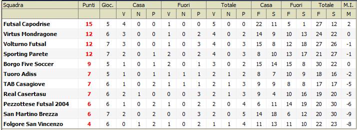 Dopo le prime sette giornate di Campionato è già possibile trarre un primo bilancio sull’andamento del Girone A di Serie D. Con cinque vittorie in altrettanti incontri disputati è saldamente al comando della classifica il Futsal Capodrise. La compagine guidata da Mister Di Giovanni potrebbe ulteriormente incrementare il bottino, dovendo ancora disputare il recupero della seconda Giornata con il Tuoro Adiss in programma per mercoledì 8, ed è in attesa dell’omologazione del pareggio della sesta Giornata con il Borgo Five Soccer. In seconda posizione con dodici punti troviamo il terzetto composto da Virtus Mondragone, Volturno Futsal e Sporting Parete. Lo Sporting dopo l’avvio sprint con tre vittorie nelle prime tre gare, ha subito una leggera flessione, ed è riuscito a rimediare solo tre punti nelle restanti tre. Altrettanto altalenante è il rendimento delle altre due società, anche se per la Virtus va fatto un discorso leggermente diverso, perché è l’unica delle tre ad aver usufruito del turno di riposo, e se non si considera la sfida in casa del Futsal Capodrise, che tra le mura amiche è un vero e proprio rullo compressore, ha subito solo una sconfitta. A nove punti (senza considerare la gara da omologare) il Borgo Five Soccer, migliore attacco del Girone con trenta gol realizzati in sole cinque partite. Staccate di due punti rispetto agli atellani troviamo altre tre società: Tuoro Adiss, TAB Casagiove e Real Casertasu. Ricordiamo però che il Tuoro ha una gara in meno delle altre due. In penultima posizione Pezzottese e San Martino Brezza, entrambe con due sole vittorie all’attivo e palma di peggior difesa del campionato. I gialloblu sono reduci da due sconfitte, in cui hanno subito ben undici reti. Diverso il discorso in casa Pezzottese, che è invece reduce da due convincenti prestazioni, in cui ha saputo modificare il trend, subendo appena 4 reti. Fanalino di coda la Folgore San Vincenzo, che ha conquistato quattro punti, in virtù del pareggio con il Tuoro e della vittoria con la Pezzottese.