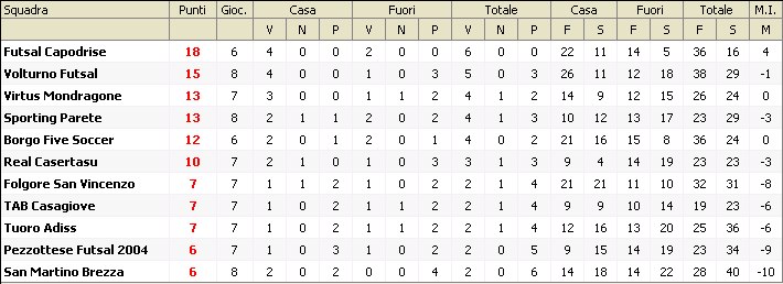 Siamo ormai giunti all’Ottava Giornata del Girone A di Serie D, turno che si è svolto regolarmente nonostante il tempo inclemente, così come è avvenuto nei Gruppi D, E, G, a differenza dei Gironi B, C, F e H sospesi per neve. Ha riposato la corazzata Futsal Capodrise, che mantiene saldamente la vetta con 18 punti conquistati in sei partite disputate (in attesa dell’omologazione del 4-4 con il Borgo Five Soccer). La netta vittoria del Volturno Futsal, l’unica squadra del Girone ad essere ancora in corsa per la Coppa Campania, che ha asfaltato con il risultato di 11-3 il Tuoro Adiss, permette agli aversani di portarsi al secondo posto in solitaria. Il pareggio tra Sporting Parete e Virtus Mondragone lascia scontente entrambe le compagini che perdono terreno dal gruppo di testa e vengono virtualmente raggiunte dal Borgo Five Soccer. Gli atellani, si sono imposti sul TAB Casagiove con il risultato di 6-2, e dopo aver subito due sconfitte nelle prime due Giornate, non hanno più perso e hanno raccolto 12 (+ 1) punti in 4 (+ 1) partite. A dieci punti troviamo il Real Casertasu che conquista la prima vittoria in trasferta sul campo della Pezzottese, guadagnando così il titolo di outsider nella corsa ai Play-Off. A sette punti invece il terzetto composto da Folgore San Vincenzo, TAB Casagiove e Tuoro Adiss, la prima può godersi una tranquilla settimana dopo l’entusiasmante vittoria nella sfida con il San Martino Brezza, mentre le altre due cercheranno di alzare subito la testa dopo le pesanti sconfitte subite. Chiudono la classifica a sei punti Pezzottese Futsal 2004 e San Martino Brezza. I sammaritani nonostante la sconfitta appaiono comunque in crescita dopo le disastrose prime quattro partite, per i brezzani invece la situazione sembra più critica dopo tre sconfitte consecutive e diciannove reti subite in tre settimane.