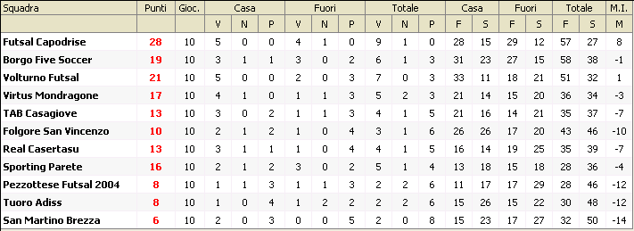 Nel Girone B la situazione per le due casertane Azteca Dragoni e Futsal Pietramelara non è delle più rosee. L’Azteca occupa il nono posto in classifica con nove punti, ma deve ancora disputare due gare rinviate a causa del maltempo. Il Futsal Pietramelara invece è impantanato all’ultimo posto con appena un punto conquistato, con un solo match da recuperare. Nel Girone C Le Due Torri Maddaloni è la dominatrice indiscussa del Campionato, con due punti di vantaggio sulla seconda e una sola sconfitta al passivo. Il San Felice a Cancello, al contrario, si trova al nono posto con undici punti, a cinque lunghezze dalla zona Play-Off. Nel Girone D lo Junior Domitia detiene momentaneamente il secondo posto in classifica con una gara da recuperare, mentre lo Sporting Villa Literno è fermo al nono posto.