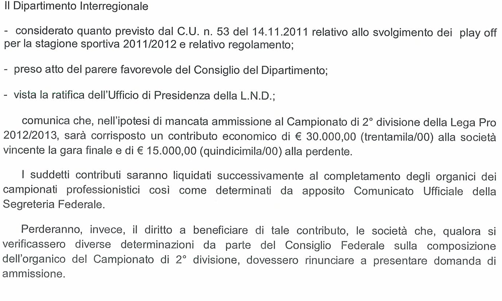 La riforma che coinvolgerà i campionati di Lega Pro avrà conseguenze anche sulla serie D. Da quest’anno infatti sarà davvero difficile ottenere il ripescaggio e allora la Lega Nazionale Dilettanti ha previsto un premio per la vincente dei playoff. Si tratta dell’esorbitante (si fa per dire) cifra di 30.000 euro alla prima classfica e 15.000 alla seconda. Soldi che non andranno a coprire le spese sostenut per arrivare fino alla finalissima. Insomma è un messaggio chiaro da parte di Tavecchio: un premio consolazione a chi onorerà la post season, ma la Lega Pro resta lontanissima. Ecco il Comunicato ufficiale della Lega.