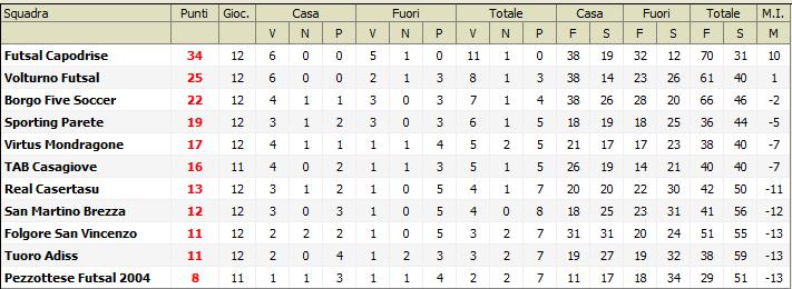 Tredicesima Giornata del Girone A di Serie D, il Futsal Capodrise conquista la vittoria numero undici e, grazie al mezzo passo falso del Volturno Futsal in casa della Folgore, aumenta il divario in Classifica con gli stessi aversani a nove punti. Il Futsal Capodrise, con i dieci gol rifilati al Tuoro Adiss, consolida il primato di migliore attacco del Girone: settanta reti realizzate. Proprio il Tuoro detiene il record negativo di peggior difesa con ben cinquantanove reti al passivo. Il Borgo Five Soccer ottiene una convincente vittoria ai danni dello Sporting Parete, si porta a sole due lunghezze sul Volturno e allunga in Classifica sullo stesso Sporting. La Virtus Mondragone incappa nella seconda sconfitta consecutiva e vede ridursi il vantaggio sul TAB Casagiove, vincitore con il Real Casertasu nella sfida di lunedì, ad un misero punto. Le due vittorie consecutive rilanciano il San Martino Brezza che adesso può guardare dall’alto in basso Folgore San Vincenzo, Tuoro Adiss e Pezzottese Futsal 2004. La sensazione ad otto giornate dalla fine è che, promozione del Capodrise esclusa, nessun verdetto sia stato scritto e l’attuale situazione in graduatoria potrebbe cambiare radicalmente nel giro di due turni. Gli appassionati del futsal casertano possono stare tranquilli, lo spettacolo delle Serie D è tutt’altro terminato.