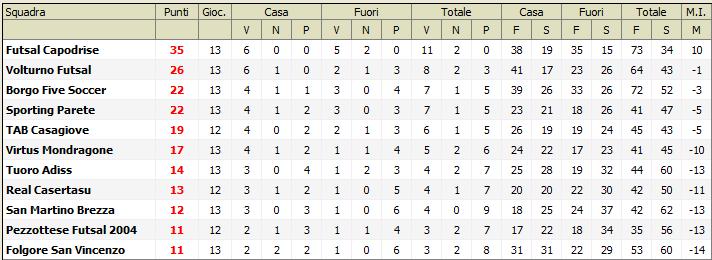 La sfida valevole per il primato in Classifica tra Volturno Futsal e Futsal Capodrise termina in pareggio, un risultato di certo favorevole alla capolista che mantiene così un distacco di nove punti sugli aversani. Le due squadre in questione hanno dimostrato di meritare appieno la testa della classifica. il Futsal Capodrise è l’unica squadra della Serie D Campania, insieme alla Virtus Telese, a non aver perso neanche una partita in Campionato e il Volturno ha raggiunto le Semifinali di Coppa Campania dove incontrerà il temibile Real Sangiuseppe. Il Borgo Five Soccer non sfrutta l’occasione del pareggio del Volturno e vede aumentare il distacco dal secondo posto di un punto a causa della sconfitta esterna con la Pezzottese. Gli atellani si vedono inoltre raggiunti dallo Sporting Parete che si è imposta nello scontro casalingo con la Folgore. Continua la seria positiva del TAB Casagiove che conquista la sua terza vittoria consecutiva, segno che l’avvicendamento in panchina tra Mister Pernice e Mister Farina ha portato grandi benefici in casa gialloblu. Vincendo lo scontro diretto con la Virtus Mondragone i casagiovesi stanno dimostrando di meritare l’ultima posizione utile per i Play-Off. Diametralmente opposta è la situazione per i mondragonesi che sono reduci da una serie terribile di tre sconfitte consecutive che hanno reso più interessante la lotta per la postseason. Dopo la pesante disfatta della scorsa settimana il Tuoro Adiss ritrova fiducia con un convincente 6-1 ai danni del San Martino Brezza che non sfrutta l’occasione per superare il Real Casertasu, nel frattempo a riposo, e compiere un piccolo miracolo dopo le cinque sconfitte consecutive. Dopo altrettanti turni senza vittorie rialza la testa la Pezzottese Futsal 2004 che supera la tenace opposizione del Borgo Five con una prova di carattere e di grande generosità sul piano fisico e tattico. Chiude la Classifica, con undici punti come i biancorossi, la Folgore San Vincenzo.
