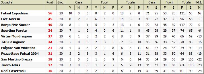 Dopo  ventidue giornate di Campionato la regular season del Campionato di Serie D è finalmente giunta al termine. Domenica scorsa il quadro del Girone A è stato completato dopo centodieci partite disputate nonostante le mille difficoltà, i recuperi, i turni infrasettimanali, un Comitato Regionale presente ai minimi termini e una classe arbitrale quasi mai all’altezza del proprio compito. I verdetti finali erano già chiari da qualche settimana, l’ultima giornata ha portato soltanto piccole modifiche alla classifica, ininfluenti per il discorso promozione.  Il Futsal Capodrise vola in Serie C2 grazie ad un cammino straordinario, esente da sconfitte e che ha portato la truppa di Mister Di Giovanni a conquistare 56 punti sui 60 disponibili. Seconda, con 11 punti di ritardo dal Capodrise il Five Aversa del Presidente Di Virgilio, che ha espresso probabilmente il miglior gioco del Girone e ha impreziosito la stagione con la vittoria della Coppa Campania. In virtù dei 18 punti di vantaggio sulla quinta classificata gli aversani giocheranno direttamente il secondo turno dei Play-Off.  L’unica gara del primo turno ad essere disputata regolarmente vedrà l’una contro l’altra Borgo Five Soccer e Sporting Parete, rispettivamente terza e quarta classificata. Termina la sua stagione al quinto posto la Virtus Mondragone che migliora sensibilmente la propria posizione rispetto alla scorsa Serie D ma non accederà alla post season a causa dei troppi punti di distacco dal Five Aversa. Il TAB Casagiove e la Folgore San Vincenzo compiono un vistoso salto di qualità terminando rispettivamente al sesto e al settimo posto. La scorsa stagione i casagiovesi hanno chiuso il campionato all’ottavo posto mentre la Folgore giunse addirittura tredicesima. La Pezzottese Futsal 2004 può ritenersi soddisfatta della sua prima esperienza in Serie D, grazie alla conquista di un ottavo posto che sarebbe stato impensabile all’inizio del Campionato. Reduce da un settimo posto in Terza Categoria di Calcio il San Martino Brezza termina questo campionato al nono posto. Scivolano in fondo alla classifica, dopo l’ottima scorsa annata Tuoro Adiss e Real Casertasu, i primi passano dal quarto al decimo posto, mentre i secondi dalla nona al undicesima e ultima posizione.