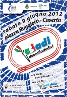 Sabato 9 giugno, alle ore 20.30, piazza Ruggiero teatro delle “ASIadi 2012”, manifestazione sportiva, sociale e culturale organizzata dal Comitato Regionale ASI della Campania con il patrocinio dell’Amministrazione Comunale di Caserta, che prende il nome dallo stesso ente organizzatore, l’ASI (Ente di Promozione Sportiva riconosciuto dal CONI).