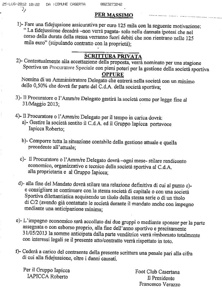 In data odierna alle ore 10.22 è pervenuto un fax presso gli uffici del Presidente Verazzo, inviato dal Comune di Caserta, che si allega al comunicato, in cui si propone l’ottenimento della gestione da parte di ‘qualcuno’ non meglio identificato e il tutto economicamente a carico della famiglia Verazzo.