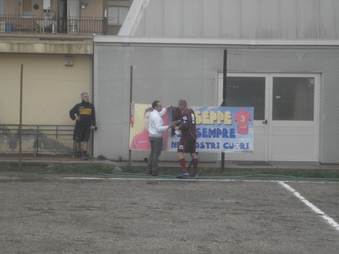 PRE-PARTITA: Primi istanti di gioco abbastanza intensi per commemorare le anime di due nuovi angeli volati in cielo da pochi giorni. Dopo la consueta e doverosa preghiera dell’intero clan giallorosso in ricordo di Giuseppe Russo, l’arbitro ha fatto rispettare il minuto di recupero in memoria di Salvatore Amatrudo, presidente del settore giovanile e scolastico venuto a mancare in settimana. Prima dell’inizio delle ostilità il capitano-allenatore del San Pio Mario Pagliuca esegue un gesto bellissimo, esponendo sullo striscione dedicato a Giuseppe Russo una maglia granata che verrà donata alla sua famiglia (gesto che la dirigenza domiziana ha voluto fortemente per affermare la propria vicinanza alla famiglia di Giuseppe Russo, il quale da titolare aveva giocato il match di Coppa Italia contro i mondragonesi all’inizio di questa stagione).