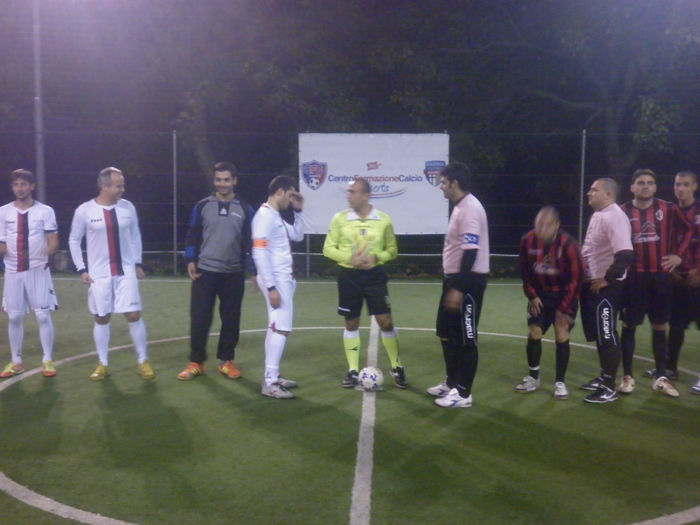 PRIMO TEMPO: I primi quattordici minuti sono di fuoco con un feroce botta e risposta che diverte gli eroici spettatori del match, solo in questo modo era possibile mettere in secondo piano il freddo gelido che è imperversato per tutti i 60 minuti. Ben sei sono le reti realizzate nel primo quarto d’ora che hanno messo in mostra pregi e difetti di entrambe le selezioni. A sbloccare la gara ci pensa D’Aniello con una conclusione angolata che bacia il palo ed entra in porta (2’). Dopo aver sfiorato il palo qualche attimo prima, il peperino Di Lella pareggia immediatamente su passaggio filtrante di Busino (5’). Il Real S.Erasmo di coach Gerardo Lieto preme il piede sull’acceleratore ed impallina Carusone in quaranta secondo prima con il classico tiro di punta di Busino (7’) e poi con il tap-in sotto porta di Di Lella (8’).  I padroni di casa non si demoralizzano e ritornano in partita con un bomba di Servodidio che pesca il sette alla sinistra dell’incolpevole Asciore (11’). Il terreno di piccole dimensioni sferra un piccolo scherzetto al passaggio di Aiezza che viene intercettato da Della Corte il quale infila Asciore (12’). Il piccolo black-out rossonero dura qualche istante, poiché Russo suona la carica colpendo il palo (13’). Più spietato è il funambolico De Crescenzo che ruba palla a Duranti, non la fa sfilare fuori e da posizione laterale beffa il suo amico Carusone con un pallonetto stupendo (14’). Favoloso goal del giovane talento vitulatino che, ancora una volta, dimostra di essere un asso nella manica di questo scacchiere.  Lo stesso De Crescenzo al 17’ si esibisce in un’azione personale, non finalizzata a causa della deviazione di Duranti in corner. Sugli sviluppi dell’angolo susseguente, Di Lella cede palla al rientrante Cecere, fermo da un mese per infortunio, che sfodera un bel destro che Carusone salva come può (18’). Dopo i tentativi di Della Corte e D’Aniello usciti fuori di un niente, i rossoneri chiudono il primo tempo in vantaggio con una chirurgica saetta rasoterra dell’eccelso Busino che pone fine ad una strana mischia (28’). Ma le emozioni durano fino all’ultimo secondo con Palumbo che coglie la traversa da fuori area nei minuti di recupero (31’).