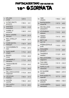 C’aveva visto lungo Giuseppe Landolfi, il manager di Ultimo Minuto, infatti proprio nell’ultimo turno del minicampionato natalizio riesce a spuntarla sui Cugini del gol, che comunque si dimostrano degli ottimi fantacalcisti. Decisivo è stato per Ultimo Minuto l’acquisto di Lamela, autore di una doppietta nella partita Roma – Milan, mentre a penalizzare gran parte dei team è stato lo juventino Vidal che sbaglia un rigore a Parma. Per quanto riguarda la classifica generale il 2012 si chiude con ztl 1000 ancora in vetta, anche se il suo vantaggio sugli inseguitori si è molto assottigliato. Il 2013 quindi darà la possibilità a tutti di rimettersi in gioco, infatti il minicampionato verrà azzerato e anche la classifica generale adesso è più aperta, inoltre a gennaio ci sarà anche la riapertura del mercato, dando la possibilità ai manager del fantacasertano di rinnovare le proprie rose. Si chiude quindi questo 2012 fantacalcistico, che ha visto sempre più aumentare le adesioni al fantacasertano, sperando che questo possa avvenire anche nel prossimo anno. Tutto lo staff del fantacasertano, nonché di sport casertano augurano a tutti i partecipanti (e non) del fantacasertano buone feste e l’arrivederci a tutti al 2013.
