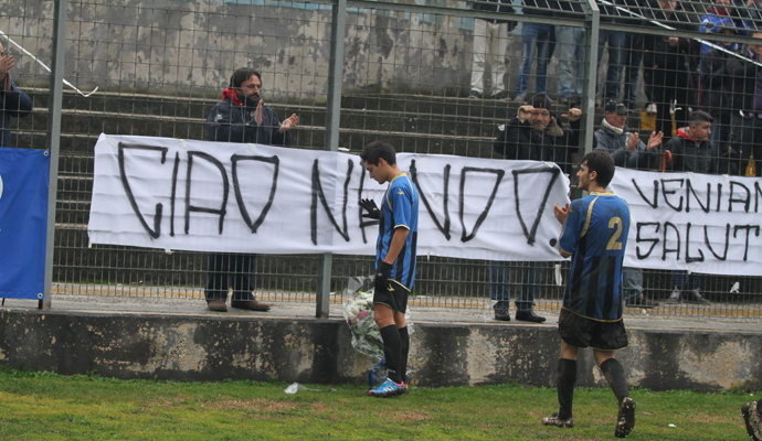 Bonavolontà davanti allo striscione dedicato al tifoso Ferdinando De Luca (foto Nando)