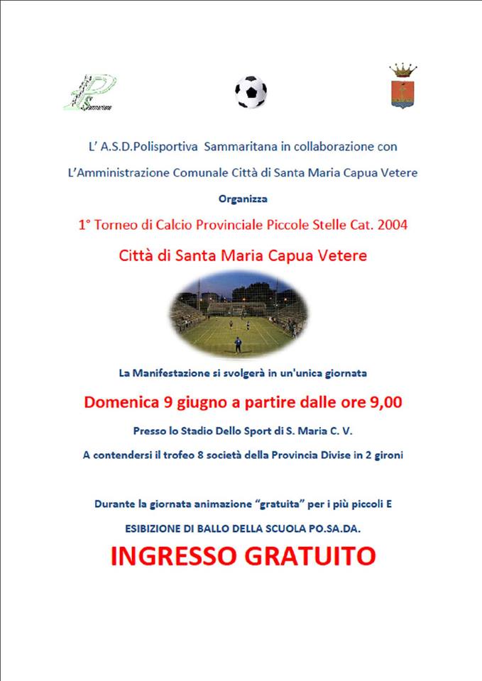 L’ASD Polisportiva Sammaritana con il patrocinio morale dell’amministrazione comunale di Santa Maria Capua Vetere organizza il “Primo Torneo di calcio provinciale Piccole Stelle, categoria 2004”. La manifestazione si svolgerà in un’unica giornata, cioè domenica 9 giugno a partire dalle ore 9,00 presso lo stadio dello sport di S. Maria C.V. Parteciperanno al torneo, e quindi si contenderanno il trofeo, ben 8 società della provincia, divise in 2 gironi. Nel gruppo A ci sono: S.C. Macerata Calcio, Sport Village, Gladiator, San Paolo Apostolo, nel girone B invece: C.S. Neapolis, Juve Sammaritana, Villa Sport e Real S. Tammaro. Durante la giornata i piccoli potranno usufruire di un’animazione gratuita. Nel corso dell’evento si esibirà anche la scuola di ballo “Po.Sa.Da.”. Al termine dell’evento tutte le società e gli atleti saranno premiati con dei gadgets gentilmente offerti da “Sport Legend”