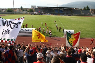 Lo stadio “Blasone” di Foligno è il palcoscenico dell’ultimo atto del campionato di Serie D 2012-13. Le protagoniste, Vecomp Verona e Casertana, si contendono l’acquisizione del diritto di priorità per la presentazione di una eventuale domanda di ripescaggio al prossimo campionato di Seconda Divisione, qualora si rendesse necessario completare l’organico delle partecipanti al campionato di Lega Pro. Insomma, in poche parole, chi vince i play off nazionali non ha il diritto e quindi la certezza di partecipare al campionato di Seconda Divisione ma sarà ammessa nel caso in cui società di Lega Pro non avessero i requisiti per prendere parte al campionato stesso. E sembra che ci sia più di una società che avrebbe problemi ad iscriversi al prossimo campionato di Seconda Divisione ed allora il successo nella finale play off offrirebbe una concreta possibilità di giocare nei professionisti l’anno prossimo. E Caserta sogna. I falchetti potrebbero tornare nel calcio professionistico a distanza di 16 anni. Foligno è colorata di rossoblu. Sugli spalti circa 1000 supporters giunti da Caserta e da varie parti d’Italia. C’è grande festa ed atmosfera da brividi. Scenografia imponente per i tifosi casertani a cui si sono “accodati” i “fratelli” di Cassino, Cosenza e Terni.