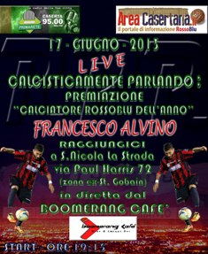 Francesco Alvino si aggiudica la seconda edizione del premio ‘Calciatore Rossoblu dell’Anno’ targato Radio Prima Rete e Areacasertana. L’esterno è stato votato dai tifosi della Casertana come calciatore simbolo della stagione 2012-13. Ogni settimana, infatti, è stato possibile esprimere la propria preferenza sul migliore in campo dell’ultima gara di campionato attraverso un sondaggio lanciato sul sito Areacasertana. Alvino ha chiuso al primo posto davanti a Giovanni Ruscio e Roberto Palumbo. Il riconoscimento verrà consegnato lunedì 17 giugno nel corso di una punta speciale di Calcisticamente Parlando, fortunata trasmissione di Radio Prima Rete condotta dai giornalisti Giuseppe Frondella e Raffaele Veccia. Per l’occasione la diretta si terrà a partire dalle ore 19:15 nell’ampio spazio verde del ‘Boomerang Cafè’ di via Paul Harris 72 a San Nicola la Strada (Area Ex Saint Gobain) e sarà aperta a tutti i tifosi che vorranno partecipare attivamente alla trasmissione. Un riconoscimento verrà consegnato anche alla Casertana Fc, rappresentata dal direttore sportivo Guglielmo Accardi e dal responsabile Area Comunicazione Cesare Salomone. Una grande festa a tinte rossoblu che si rinnova dopo l’ottima riuscita della prima edizione che aveva visto trionfare i centrocampisti Augusto Burgos e Vincenzo Pontillo.