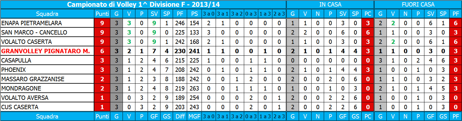 GRANVOLLEY PIGNATARO: Bassano, Rotoli 8, Magliocca 6, Veltre 16, Parisi 15, D. Sgueglia, I. Sgueglia, Giordano 3, Di Monaco 12. All. Iacono