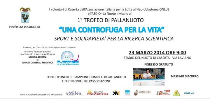 Il 1° trofeo di pallanuoto maschile under 17 “Una controfuga per la vita” è stato organizzato dalla Asd Onda Nuoto Caserta presieduta da Francesco Provasi, con i volontari del capoluogo di Terra di Lavoro dell’Associazione italiana per la lotta al neuroblastoma.