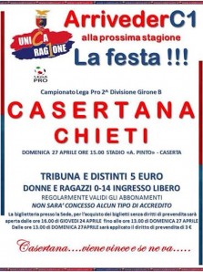 “ArrivederC1 alla prossima stagione”. La Casertana è pronta a salutare i suoi tifosi dopo un’annata da ricordare. Appuntamento per domenica 27 aprile alle ore 15 per l’ultima uscita interna della stagione contro il Chieti. Il club rossoblu saluterà il popolo di fede rossoblu con un evento in corso di allestimento, i cui dettagli verranno illustrati nei prossimi giorni. Confermata l’iniziativa che ha riscosso tanto successo in occasione della sfida con il Melfi: biglietto unico per Tribuna e Distinti al costo di 5 euro. Ingresso libero per i ragazzi fino a 14 anni e per le donne. Quest’ultime dovranno recarsi presso la sede di viale Medaglie d’Oro, munite di copia di documento d’identità, per effettuare la necessaria e indispensabile registrazione. La biglietteria presso la sede della Casertana, per l’acquisto dei biglietti senza diritti di prevendita e la registrazione per l’ingresso libero-donna, sarà aperta da giovedì 24 aprile alle ore 16 fino a domenica alle ore 13.