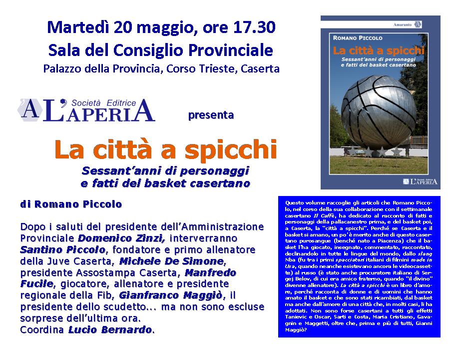 “La città a spicchi” sessant’anni di personaggi e fatti del basket casertano, è il titolo del libro di Romano Piccolo, edito dalla società L’aperia, che sarà presentato martedì 20 maggio alle 17,30 nella sala del consiglio provinciale in corso Trieste a Caserta.