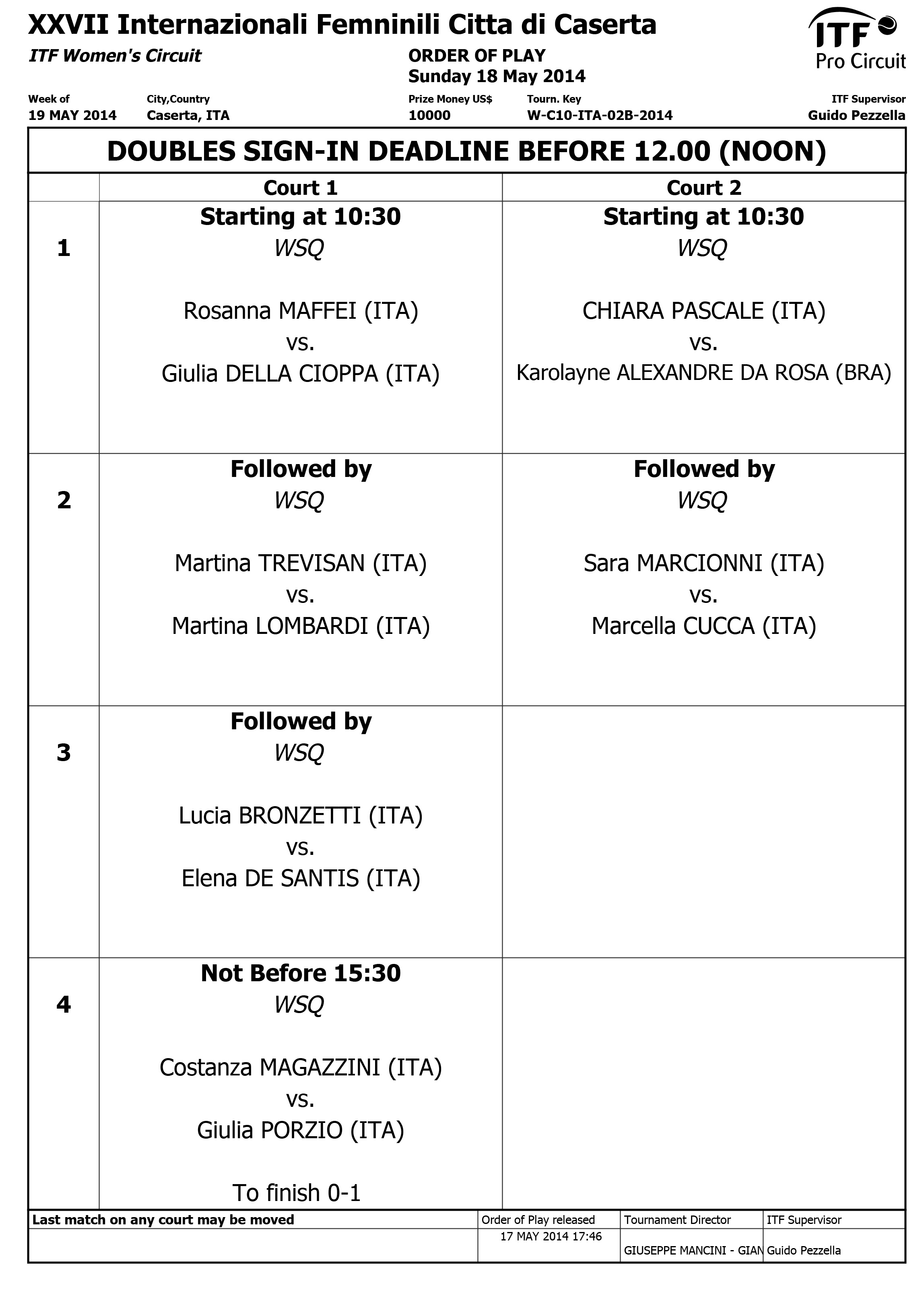 Alle 10,30 il primo incontro in programma è quello fra la beneventana Rosanna Maffei e la casertana Giulia Della Cioppa, previsto sul campo 1, sul campo numero 2 si affronteranno invece fra la casertana Chiara Pascale del Tennis Club Ercole e la brasiliana Karolayne Alexandre De Rosa (numero 127 del ranking nazionale). A seguire sul campo numero 1 giocheranno la fiorentina Martina Trevisan, sorella di Matteo numero 395 della classifica Atp e la romana Martina Lombardi tesserata per il TC Poggibonsi e sul secondo campo si affronteranno Sara Marcionni del Tennis Club Rozzano e la romana Marcella Cucca. Poi si prosegue con incontri solo sul primo campo per consentire una migliore visione al pubblico presente.