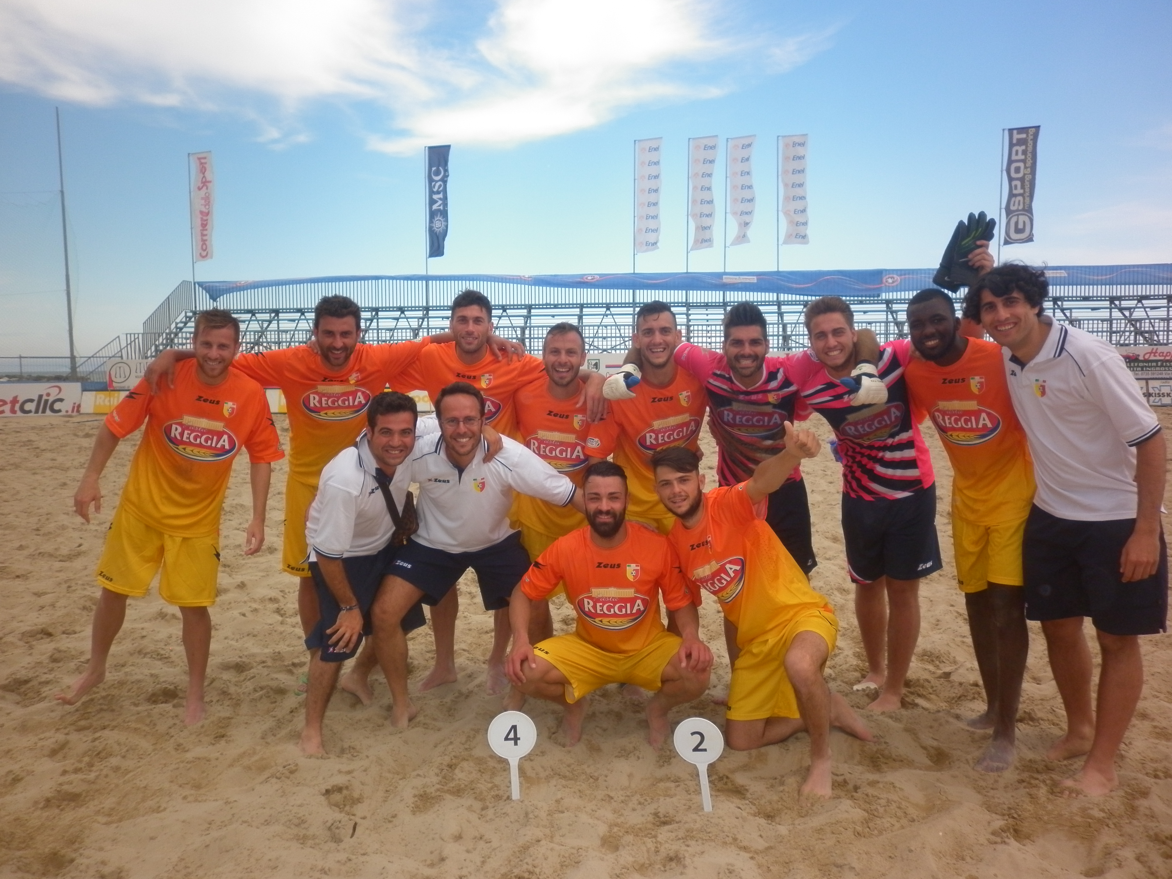 Il riscatto della Pasta Reggia Hermes Casagiove. Dopo aver abdicato al primo turno contro il Lamezia Terme, la compagine giallorossa preme il tasto “reset” e costruisce una perfomance da incorniciare che spiazza completamente il Catanzaro, alla seconda giornata della Enel Coppa Italia. Allo “Smart Beach Arena” della Riviera delle Palme di San Benedetto del Tronto, i casagiovesi sconfiggono con il punteggio di 4-2 i calabresi e danno una bella sterzata alle loro ambizioni, rientrando nello sbarramento che condurrà ad insediarsi tra il 9° ed il 12° posto. Decisive le doppiette di Vincenzo Capobianco e Raffaele Corsale, perfetti nel concretizzare la gran mole di gioco e mandare in porto una gara che nel secondo tempo si stava complicando inesorabilmente. Ma a nulla sarebbero valsi i goal, qualora il portiere Tommaso Merola non avesse eretto un muro davanti la porta, con dei riflessi che lo speaker ed i giornalisti, presenti in tribuna stampa, hanno sottolineato ripetutamente. Domani pomeriggio alle 13, il Canalicchio Catania sarà la prossima sfidante di Tommaso Merola & soci, i quali in massa dedicano il primo trionfo della stagione 2014 a Giuseppe Feola, condottiero che la passata stagione contribuì alla promozione nella Serie A Enel e che ha lasciato la vita terrena lo scorso 11 aprile. A lui il pensiero di un’affermazione che, senza il suo apporto, non sarebbe stata possibile.