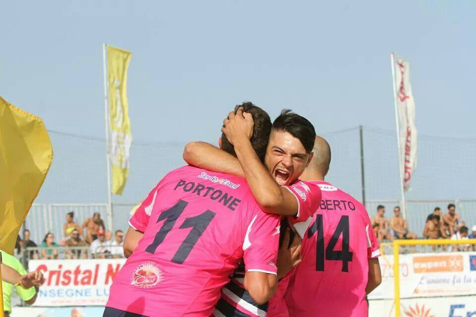 Vincenzo Santonastaso esulta con Portone, in una gara dell'Hermes Beach Soccer