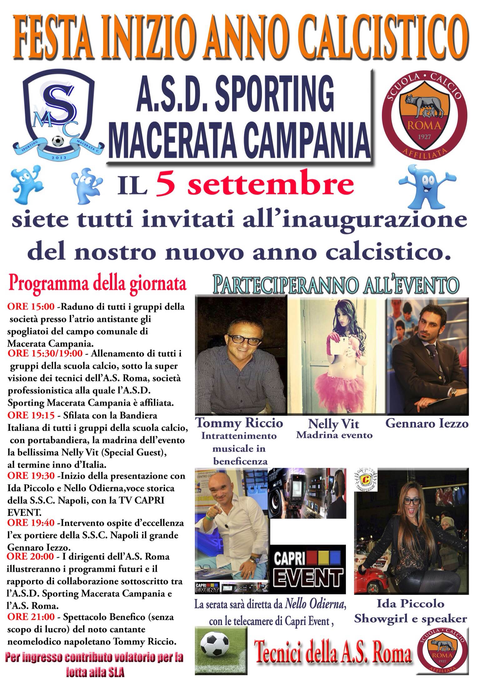 Debutto in grande stile per l’A.S.D. Sporting Macerata Campania. Per l’inizio del secondo anno di attività agonistica, lo staff societario ha deciso di organizzare una grande festa, in maniera tale da inaugurare nel migliore dei modi l’annata 2014-2015. L’appuntamento è fissato per domani, venerdì 5 settembre 2014, al campo sportivo “Comunale” di Macerata Campania dove, a partire dalle 15, inizieranno una serie di eventi finalizzati ad unire lo sport con il divertimento. Ampio risalto per la preziosa affiliazione per il secondo anno consecutivo con l’A.S. Roma, che invierà propri tecnici a visionare gli allenamenti delle varie compagni dello Sporting Macerata Campania, oltre a dirigenti che illustreranno i programmi della nuova stagione. Piatto forte del menu maceratese è l’intervento dell’ospite d’onore Gennaro Iezzo, ex portiere della S.S.C. Napoli, all’interno dello spettacolo d’intrattenimento che sarà presentato dal conduttore ed opinionista storico delle vicende del Napoli Nello Idierna. Particolarmente soddisfatti dell’organizzazione dell’evento il presidente Antonio Petrillo, il direttore sportivo Domenico D’Ambrosio e colui che ha curato sin nei minimi particolari l’evento, Antonio Piccerillo, i quali invitano la cittadinanza, non solo di Macerata Campania ma anche dei paesi limitrofi, a prendere parte alla manifestazione.