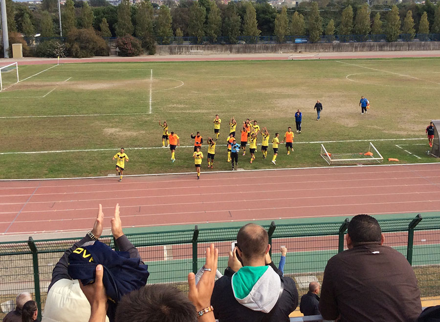 SECONDO TEMPO. La ripresa si apre con il predominio territoriale della Sessana che va alla ricerca del vantaggio. Al 55′ lo sfiora Bosco che addomestica in area un cross da sinistra dell’ottimo De Vincenzo e spara con il mancino; Esposito è reattivo a tuffarsi sulla sua sinistra e respingere allontanando il pericolo. Quattro minuti dopo clamorosa ingenuità di Ascione, entrato poco prima per l’infortunato Asile, che si fa cacciare via dal direttore di gara per aver detto qualche parola di troppo. La superiorità numerica gasa oltremodo i gialloblù che spingono con maggior determinazione alla ricerca del gol. Al 61′ splendida combinazione Rosi-Bosco che libera al tiro sul secondo palo Marcello Fava, il piatto destro del fantasista sessano è telefonato e finisce docile tra le braccia di Esposito. È il preludio al gol che arriva cinque giri di lancette dopo: palla con il contagiri di Rosi per Palumbo che va via in progressione, protegge palla è una volta davanti al portiere avversario lo fredda di destro con un ‘killer istinct’ da grande attaccante (66′). Tripudio gialloblù per il sesto gol dell’ariete gialloblù che aggancia Solano del Volla in vetta alla classifica marcatori. Sulla scia dell’entusiasmo generato dal vantaggio, gli ospiti vanno vicini al raddoppio con Rosi che combina con Marcello Fava da angolo ma poi apre troppo il destro a giro sulla sponda del numero sette aurunco che lo libera al tiro con un tocco di tacco per palati finissimi (68′). La reazione del Ponticelli è tutta nel gran destro dal limite di Colonelli che si gira in un fazzoletto e sfiora la traversa, complice una deviazione dei difensori ospiti. A dodici dal termine Dino Fava sfiora il raddoppio con un colpo di testa che Esposito alza in angolo sul preciso cross da sinistra di De Vincenzo che calibra bene il mancino dopo aver disorientato il marcatore con una bella finta (78′). Pagano prova a rifarsi al minuto 86′ ma la sua punizione mancina lambisce la traversa della porta difesa da Ciontoli e si spegne sul fondo. A pochi secondi dal novantesimo la Sessana costruisce in contropiede una grande occasione per chiudere il match: Caterino riceve palla, supera la metà campo ed apre per Marraffino con un gran tocco di esterno destro; il biondo attaccante si invola da solo verso la porta avversaria ma tarda a calciare e viene recuperato dalla retroguardia biancorossa. I tre minuti di recupero trascorrono senza pericoli per gli ospiti che possono esultare sotto il settore ospiti dopo il triplice fischio finale. Un’altra vittoria in trasferta, la terza in stagione; ottimo viatico prima del big match di domenica prossima contro la corazzata Turris.