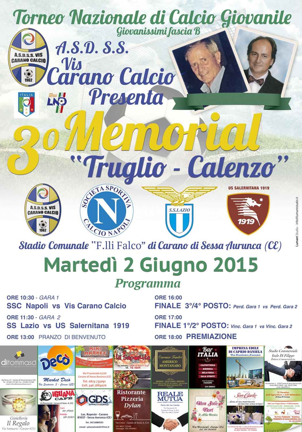 E’ tutto pronto a Carano di Sessa Aurunca per il consueto appuntamento con il Memorial “Truglio – Calenzo” giunto ormai alla terza edizione. La manifestazione è organizzata come ogni anno dalla Vis Carano Calcio del presidente Lorenzo Fusco che, coadiuvato dai suoi fedeli collaboratori, ha migliorato ancora una volta il torneo allargando la partecipazione a quattro squadre: a sfidare i padroni di casa della Vis Carano ci saranno tre prestigiose società calcistiche del panorama nazionale come SSC Napoli, SS Lazio e US Salernitana. Il torneo Nazionale di Calcio Giovanile è riservato alla categoria “Giovanissimi fascia B” e si terrà presso l’impianto sportivo ‘F.lli Falco’ di Carano il giorno martedì 2 giugno a partire dalle ore 10:30. I gialloblù padroni di casa saranno allenati dal tecnico Franco Sorgente che avrà a disposizione una rosa formata dal blocco di nati nel 2001 della compagine caranese più una selezione di calciatori provenienti da diverse scuole calcio del casertano e del napoletano, scelti dallo staff tecnico della Vis Carano in collaborazione con l’agente FIFA Domenico Trombetta e Diego D’Orta dello Studio Doha. La manifestazione è stata creata tre anni fa per omaggiare il ricordo di due uomini che hanno dato tanto allo sport caranese, Mimmo Calenzo e Crescenzo Truglio. E’ prevista la presenza all’impianto sportivo di numerosi addetti ai lavori e osservatori, oltre a quella delle autorità locali. Il programma del torneo vede cominciare in mattinata la manifestazione con la prima sfida tra Vis Carano Calcio e SSC Napoli, a seguire l’incontro tra SS Lazio e US Salernitana. Poi ci sarà un pranzo di benvenuto offerto dai padroni di casa e nel primo pomeriggio si riprenderanno le attività agonistiche con le due finali: prima si sfideranno le perdenti dei primi due match per la finalina valevole per il 3° e 4° posto, subito dopo la finalissima tra le due vincenti delle semifinali per stabilire la squadra che si aggiudicherà il trofeo. Subito dopo la conclusione dei match ci sarà la premiazione di rito ed i dovuti ringraziamenti a tutti coloro che hanno contribuito alla riuscita del torneo.