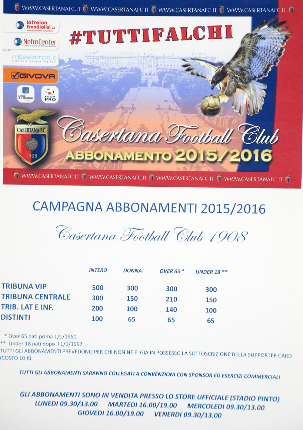La Casertana ha lanciato ufficialmente la campagna abbonamenti. Prezzi molto popolari per invogliare il pubblico a contribuire e riempire lo stadio. Questi prezzi scelti dal club: