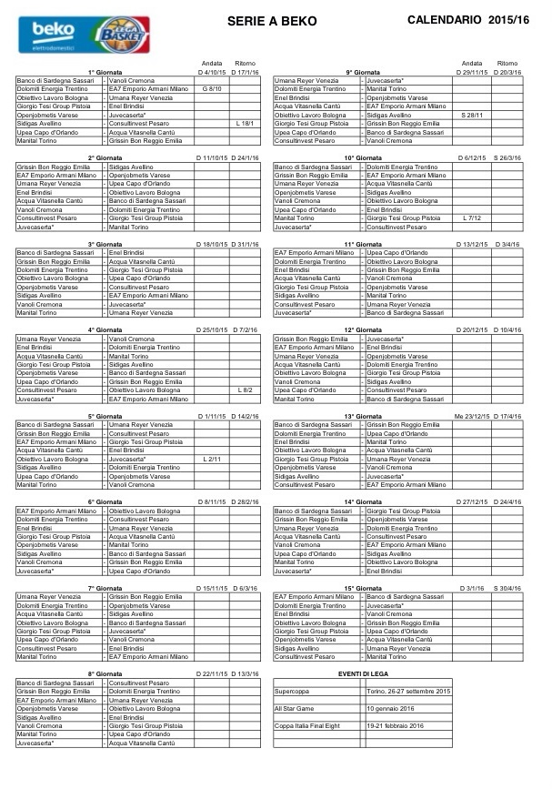 E’ stato disegnato il calendario della nuova Lega A. Caserta partirà lontano dalle mura amiche: dopo l’esordio in trasferta a Varese (4-10-2015), la prima casalinga con Torino (11 ottobre). Poi si andrà a Cremona (18 ottobre) e già alla quarta Milano al PalaMaggiò (25 ottobre). Quinta di campionato in posticipo a Bologna (lunedì 2 novembre) contro la Virtus dell’ex Michele Vitali. La sfida con la Pistoia di Enzo Esposito ci sarà alla settima giornata, il 15 novembre. Per il derby contro Avellino, quest’anno arricchito dall’arrivo in Irpinia di coach Sacripanti, bisognerà attendere fino al 23 dicembre. Alla decima giornata la rivincita al PalaMaggiò dello scontro salvezza dell’anno scorso, contro Pesaro. In foto tutto il calendario.