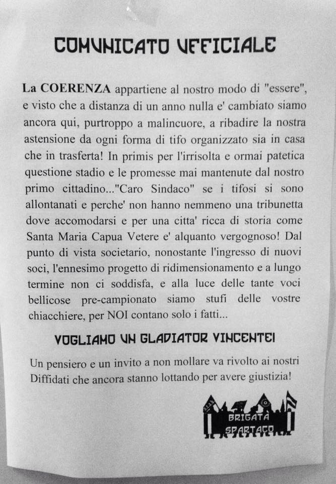 “La COERENZA appartiene al nostro modo di “essere”, e visto che a distanza di un anno nulla e’ cambiato siamo ancora qui, purtroppo a malincuore, a ribadire la nostra astensione da ogni forma di tifo organizzato sia in casa che in trasferta! In primis per l’irrisolta e ormai patetica questione stadio e le promesse mai mantenute dal nostro primo cittadino…”Caro Sindaco” se i tifosi si sono allontanati e perche’ non hanno nemmeno una tribunetta dove accomodarsi e per una citta’ ricca di storia come Santa Maria Capua Vetere e’ alquanto vergognoso! Dal punto di vista societario,nonostante l’ingresso di nuovi soci,l’ennesimo progetto di ridimensionamento e a lungo termine non ci soddisfa, e alla luce delle tante voci bellicose pre-campionato siamo stufi delle vostre chiacchiere,per NOI contano solo i fatti…VOGLIAMO UN GLADIATOR VINCENTE! Un pensiero e un invito a non mollare va rivolto ai nostri Diffidati che ancora stanno lottando per avere giustizia!”
