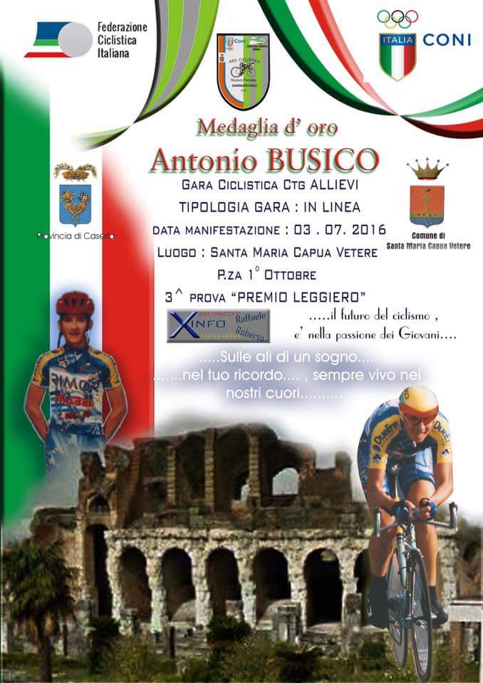LA STORIA. Antonio Busico, nato a Santa Maria Capua Vetere il 27 giugno 1984, comincia la sua attività ciclistica all’età di 14 anni, disputando alcune delle ultime gare della stagione 1998 nella categoria Esordienti (2° anno) nel G.S. “S. Erasmo” di Santa Maria Capua Vetere. Nel 1999 passa con il G.S. “Velo Club” di Caserta e, sebbene avesse pochissima esperienza, raggiunge ottimi risultati nella categoria “Allievi” (1° anno). Nel 2000 viene prelevato dal G.S. Pianura di Napoli, mettendosi in evidenza sin dalle prime gare ed ottenendo delle bellissime vittorie e tantissimi piazzamenti. Grazie ai consigli tecnici del professor Pino Cutolo, egli migliora ed alla fine del 2° anno di Allievi viene corteggiato da alcune squadre toscane. Proprio in Toscana vince brillantemente una gara a Pontassieve, tanto che la G.S. “Arianna Rimor” di San Gimignano (Siena) acquisisce le sue prestazioni dal 2001. Subito i nuovi dirigenti intravedono delle spiccate doti da “passista” e per questo motivo viene chiamato a disputare delle prove per un eventuale ingresso in Nazionale. Ed al termine della seconda prova, valevole per le selezioni per i Mondiali a cronometro, arriva la sua prematura scomparsa. Durante il viaggio di rientro dalla Toscana il 17 luglio 2001, la vettura su cui viaggia viene coinvolta in un incidente stradale ed Antonio perde la sua giovane vita, ad appena diciassette anni. Una scomparsa che, a quindici anni di distanza, rattrista quanti lo conoscevano ed hanno spinto due suoi amici ad organizzare una gara ciclistica per non dimenticare.