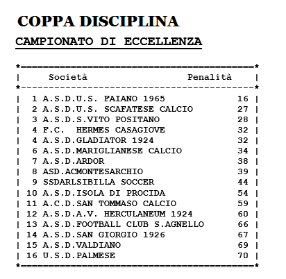 Nel frattempo il club di Casagiove si gode una nuova gratificazione del grande lavoro svolto in questi anni. Nel comunicato numero 137 del 30 giugno 2016, l’ultimo della stagione 2015-2016, il Comitato Regionale Campano ha pubblicato non solo le classifiche definitiva ma anche le graduatorie di Coppa Disciplina. L’Hermes Casagiove è la prima classificata del girone A con sole 32 penalità ricevute. E’ un primato pari merito con il Gladiator, ma il Comitato legittima il primo posto ai casagiovesi che quindi risultano la compagine “più buona del girone A”. Accorpando i due gironi, l’Hermes è al quarto posto, dietro il Faiano, la Scafatese ed il San Vito Positano: tutte e tre partecipanti al girone B. Buone notizie anche per la juniores e l’Under 17, entrambe allenate da Luigi Esposito e rispettivamente giunte none ed ottave con 10 e 16 penalità conseguite. E’ questo l’ennesimo scudetto vinto in trentatré anni di storia dall’Hermes Casagiove, sodalizio che ha sempre avuto alti valori ed ideali nel proprio DNA.