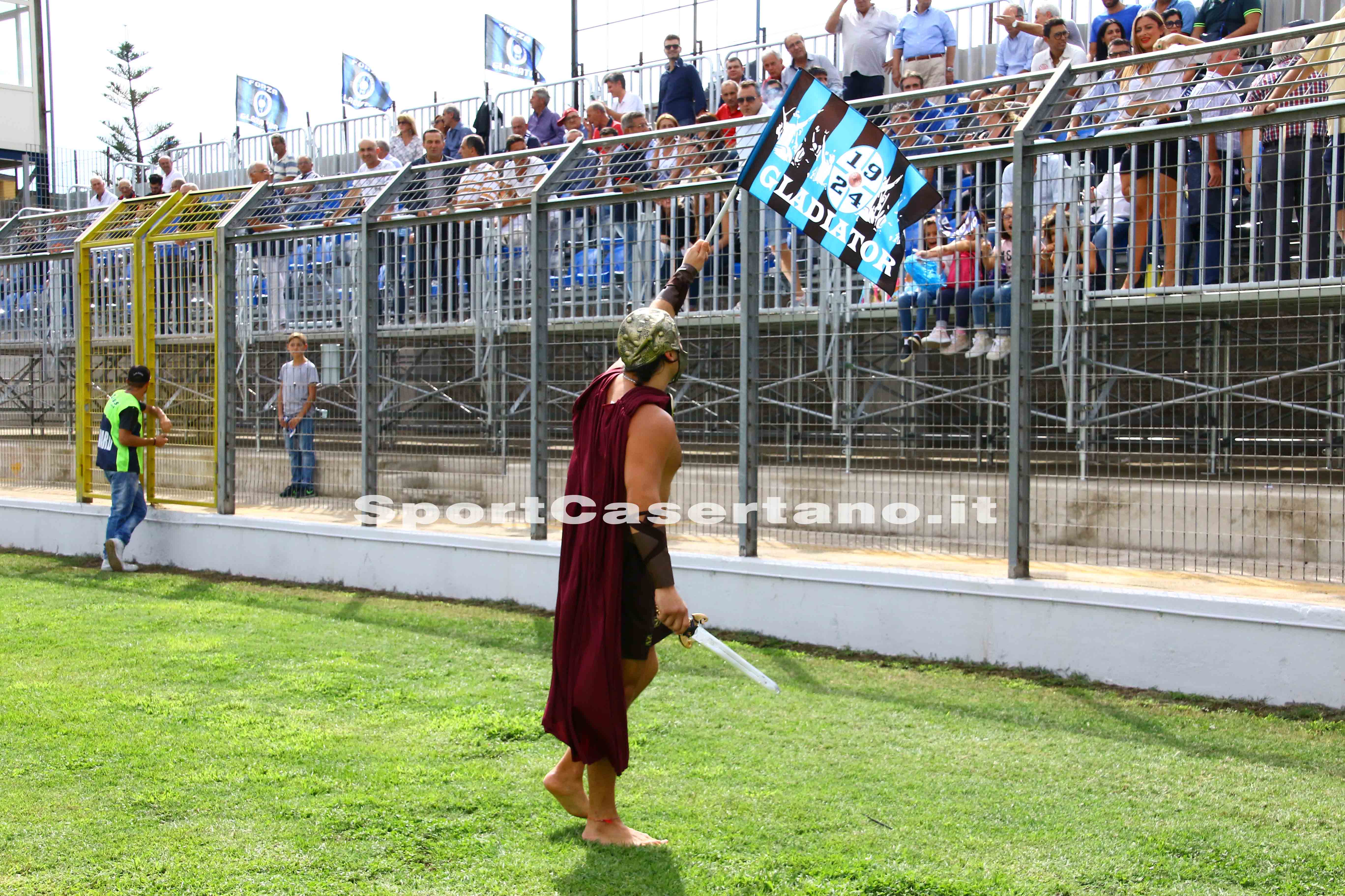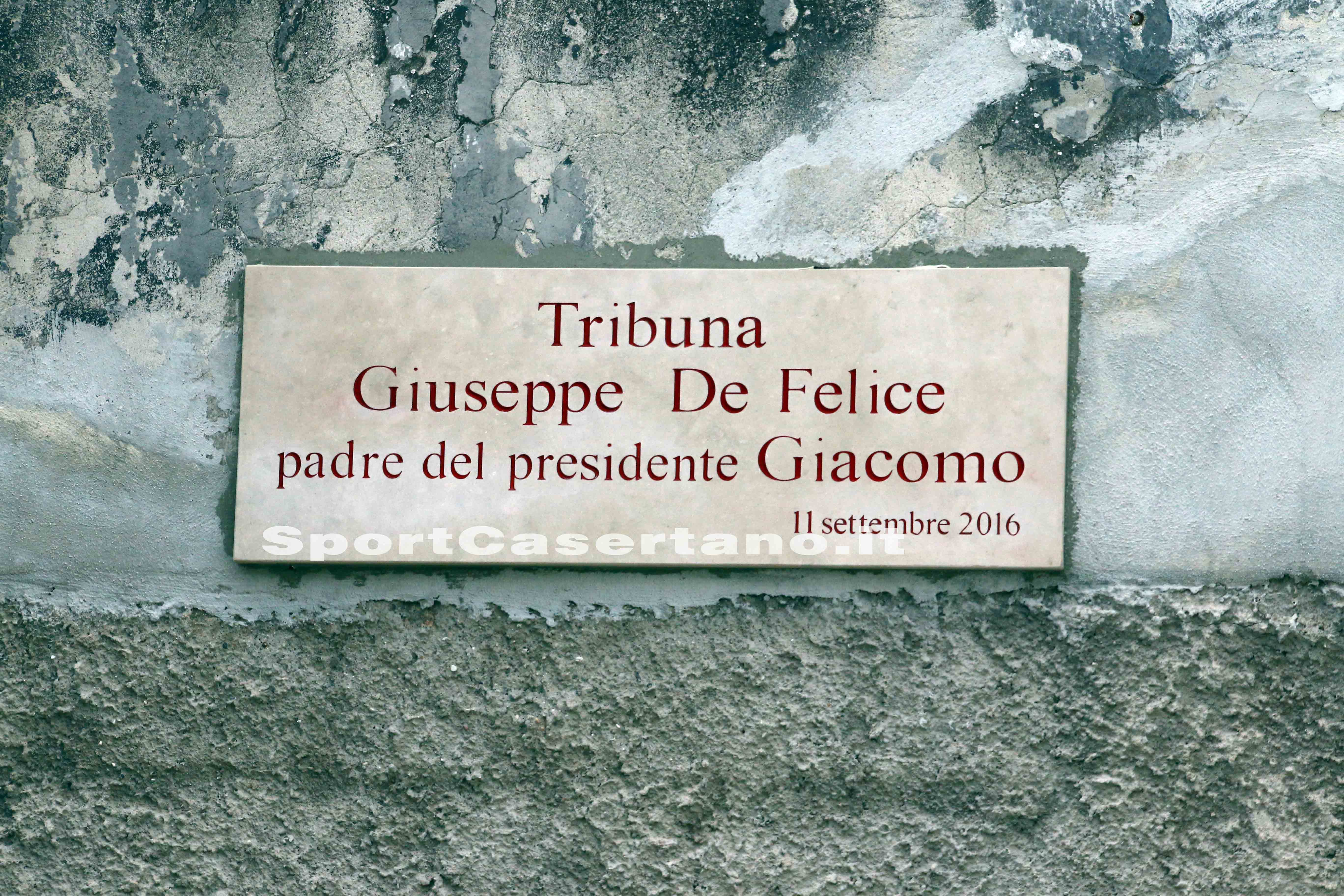 SANTA MARIA CAPUA VETERE. Diversi eventi hanno fatto da cornice all’esordio casalingo del Gladiator nella stagione 2016-2017. Prima dell’incontro vinto da Lagnena & soci per 2-0 (CLICCA QUI PER LEGGERE CRONACA E TABELLINO DELLA GARA), la nuova società neroazzurra, guidata dal trio De Felice-Morico-D’Anna, alza il sipario sulla nuova veste del Mario Piccirillo, impianto divenuto un gioiellino grazie ai lavori di ammodernamento compiuti in estate ed all’installazione delle tribune prefabbricate che hanno apportato l’aumento del numero spettatori a 1.350 unità. E’ stata inaugurata la tribuna “Giuseppe De Felice”, dedicata al padre del vicepresidente Giacomo che ha tolto il velo all’incisione.