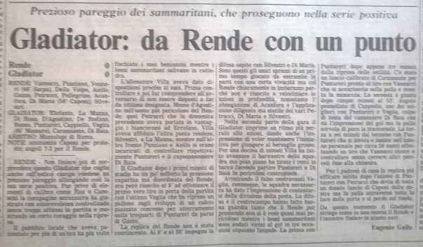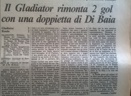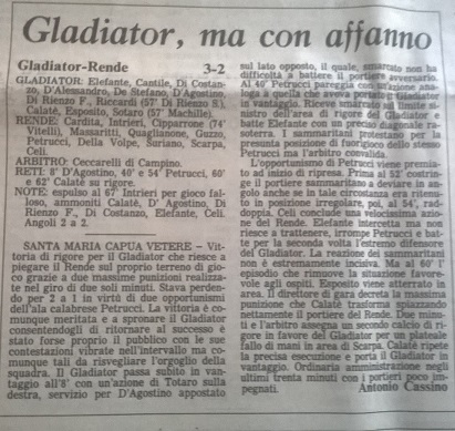SANTA MARIA CAPUA VETERE – Per la settima volta nella propria storia si confrontano Gladiator e Rende. Precedenti che riguardano solo gli quarantasei anni, poiché il Rende è stato fondato nel 1968, in seguito alla fusione tra la Costantinopolitana ed il Pisacane. I primi scontri sono avvenuti in Serie D nella stagione 1977-1978, dall’epilogo differente per le due compagini. Il Gladiator si salvò per un pelo poiché, a pari punti con Terracina e Giugliano, ebbe la meglio per la differenza reti migliore. Il Rende arrivò terzo in campionato ma ottenne la promozione alla Serie C2, categoria che debuttò proprio in quell’estate dopo la riforma della C che si divise in C1 e C2.