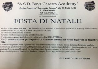 Si svolgerà giovedì 22 dicembre presso il teatro della Parrocchia S.S. Nome di Maria a Puccianiello la Festa di Natale della Caserta Academy. La cerimonia sarà ricca di bei momenti. Regali natalizi per tutti i bambini iscritti. Verranno sorteggiati premi favolosi messi in palio attraverso il calciolotteria. 1° e 2° numero estratto per Napoli e 1° e 2° estratto per Roma di giovedì 22 dicembre 2016. Per l’occasione ci sarà un fotografo per le foto di rito e le telecamere di sportcasertano che immortaleranno l’intero pomeriggio. Si inizia alle 17.30 in chiesa per la Santa Messa e poi tutti in teatro per l’inizio dell’evento.