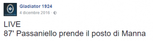 LA TESI DEL GRAGNANO. Da parte sua, il Gragnano attesta che, al posto di Manna, sia entrato il numero 16 Salvatore Passariello (classe ’97), quindi nulla cambiava con un ’97 che lascia spazio ad un altro ’97. La tesi del Gragnano viene confermata dalle varie cronache apparse sugli organi di informazione, anche dal nostro portale (CLICCA QUI PER LEGGERE) e perfino dalla diretta testuale apparsa sulla pagina ufficiale facebook, gestita dall’ufficio stampa del Gladiator (come attesta lo screenshot che vi proponiamo sulla sinistra).