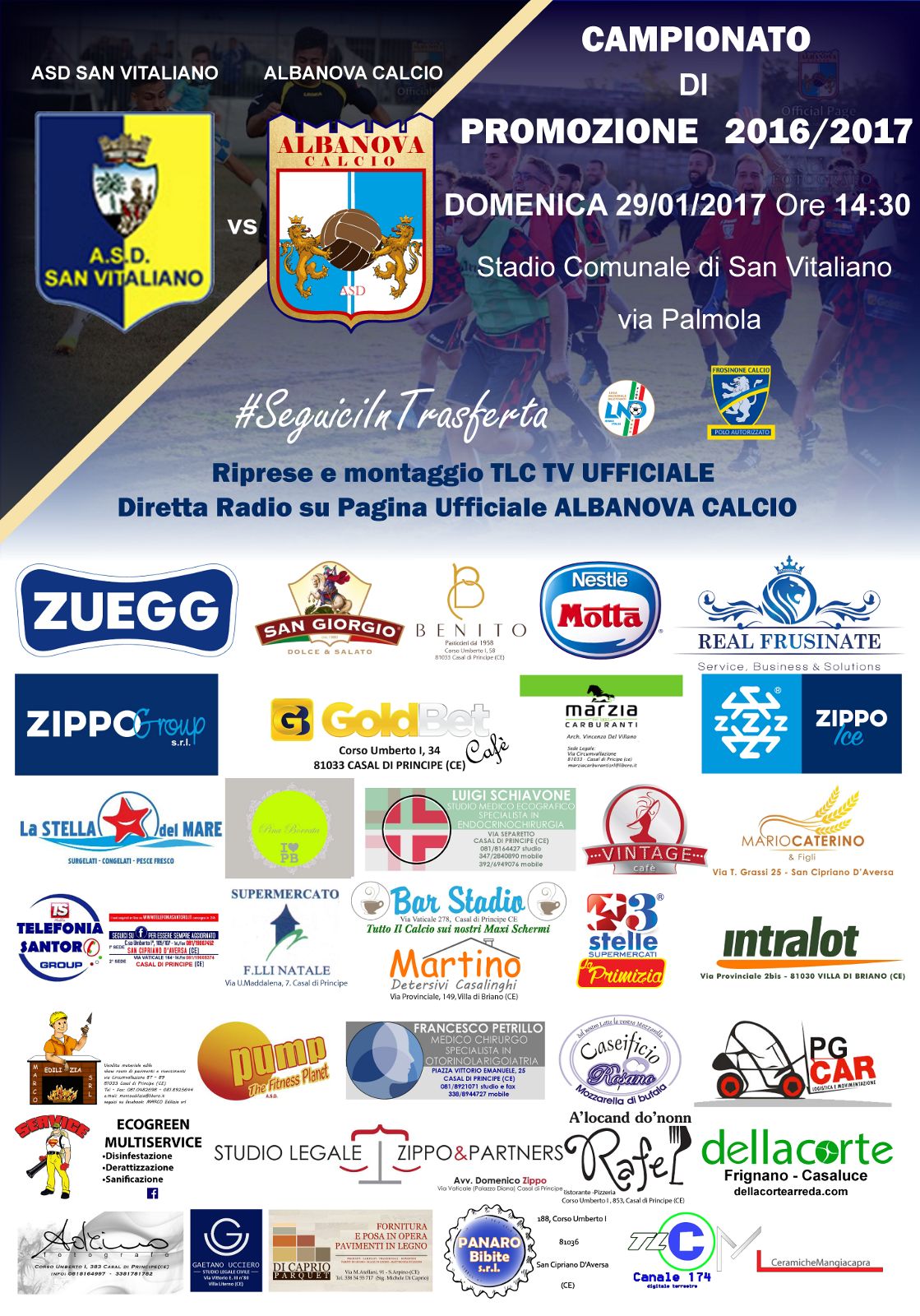 TV E RADIO – La partita sarà ripresa dalle telecamere dell’emittente ufficiale del club TLC Telelibera Campania (canale 174 del digitale terrestre) e andrà in onda integralmente martedì alle 20. Sarà inoltre possibile seguire la consueta radiocronaca in diretta al link http://www.spreaker.com/user/4732073, che sarà pubblicato sulla pagina Facebook Albanova Calcio pochi minuti prima del calcio d’inizio.