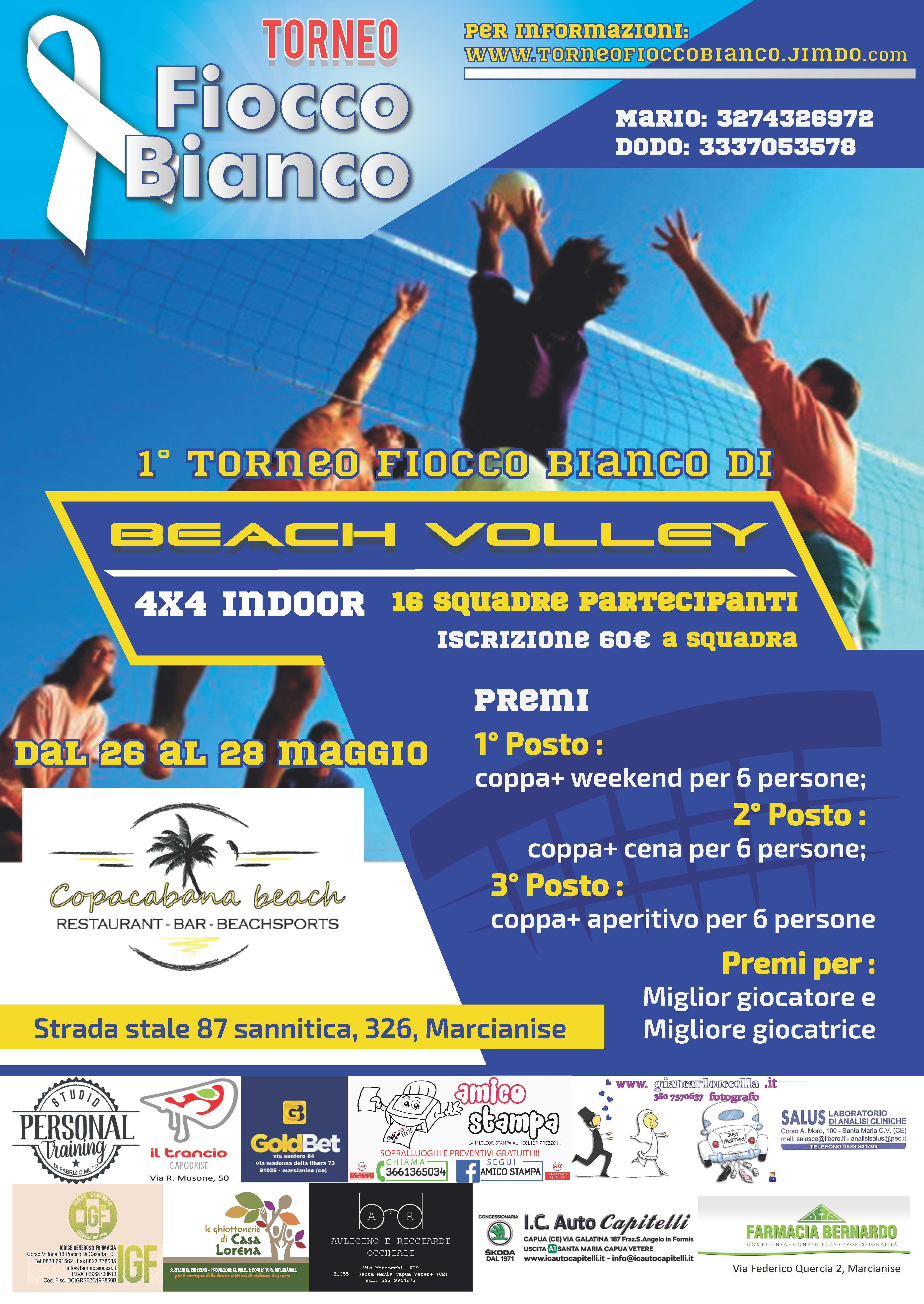 Dopo quasi quattro anni di assenza torna il Torneo Fiocco Bianco. La Pezzottese Futsal 2004, l’associazione organizzatrice di una delle manifestazioni più prestigiose del Calcio a 5 Amatoriale di Terra di Lavoro, con la collaborazione del Copacabana Beach, ha deciso di realizzare un nuovo evento. Il 26, 27 e 28 maggio, presso il Copacabana Beach di Marcianise, si svolgerà il 1° Torneo di Beach Volley 4X4 Fiocco Bianco. L’iniziativa, come sempre dedicata alla sensibilizzazione sulle tematiche della violenza di genere, vedrà 16 squadre contendersi un Weekend per sei persone. Al Torneo potranno prendere parte sia squadre miste che formazioni composte unicamente da maschi o da femmine. La struttura, interamente al coperto, dispone di campi climatizzati docce, spogliatoi, parcheggio riservato, bar, ristorazione e farà da cornice ideale ad un’iniziativa sportiva e culturale indimenticabile. Per iscrizioni e informazioni: 3337053578 – 3274326972.