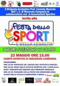 Iniziativa nata dalla rete consolidata tra l’Istituto Comprensivo ‘Presidio della Legalità’ e le associazioni del territorio. L’Istituto Comprensivo ‘Presidio della Legalità’ di Macerata Campania, coordinato dalla preside Carmela Mascolo, unitamente alle associazioni sportive cittadine, ed in collaborazione con l’amministrazione comunale guidata dal sindaco Stefano Cioffi, ha organizzato per lunedì 22 maggio la ‘Festa dello Sport e della Legalità’. Alle ore 15 partirà un corteo di ragazzi dall’Istituto Pascoli fino all’impianto di Via Garibaldi. Dopo l’esecuzione dell’ ‘Inno alla Gioia’ di apertura dei giochi da parte degli studenti del corso ad indirizzo musicale, si passerà alle attività vere e proprie di lancio, salto in alto, pallacanestro e pallavolo. La manifestazione, sostenuta dal Coni Provinciale, si concluderà con le premiazioni e le esibizioni dei ragazzi dei due gradi dell’Istituto. Si tratta di una manifestazione che coinvolgerà trecento alunni e metterà in rete le realtà sportive locali Amici del Volley, Dinamic Center, Mope Basket, Associazione ‘Na chiacchiera’. Federitalia, Federciclismo, Karate Maurino, Fics Boxing Team Iodice. Coca Cola, Ferrarelle, Vivibio,. Pizza Doro e Dop, Kids Club, Nero Caffè, Coffé Shop, R.P. Impianti, Studio Legale Pasquale Nacca. Il gruppo di governo cittadino capitanato da Cioffi ha messo a disposizione lo Stadio Comunale ed ha garantito l’impianto audio per le comunicazioni di servizio e la musica.
