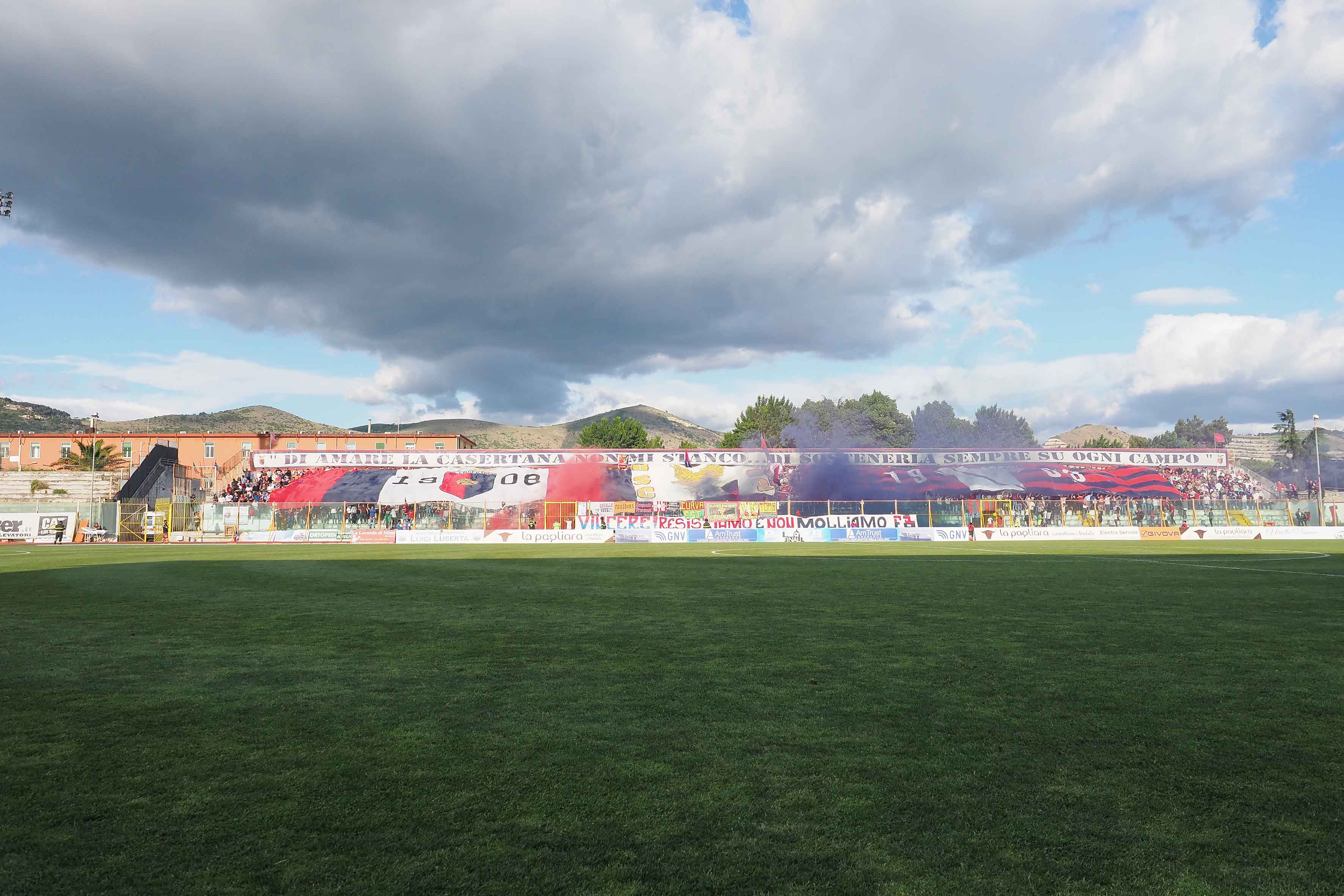 Nei minuti che hanno preceduto Casertana-Alessandria è andata in scena una scenografia straordinaria nel settore distinti. Due bandieroni che hanno coperto le zone laterali raffiguranti il simbolo della Casertana 1908 e una maglia bianca su sfondo rossoblù. Al centro un falco con la sigla Unione Sportiva Casertana e la data di nascita 1908. Poi fumogeni rossoblù a mettere la ciliegina su una torta meravigliosa. Tutto lo stadio si è poi unito ai cori dei tifosi facendo diventare l’impianto di Via Medaglie d’Oro un catino infernale come i vecchi tempi. Il video che segue è da brividi!
