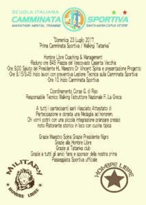 Il trainer Fiorentino La Greca si adopererà per attivare a breve sul territorio un programma condiviso con le scuole per l’avvicinamento allo sport dei ragazzi e per diffondere una cultura del benessere. Le attività, completamente gratuite, della Scuola Italiana Camminata Sportiva S. Maria Capua Vetere-Caserta hanno come base di partenza la villa Comunale della città sammaritana, ogni sabato alle 15,00 e domenica alle 8,00. Le notizie sono riportate sulla pagina Facebook del gruppo.