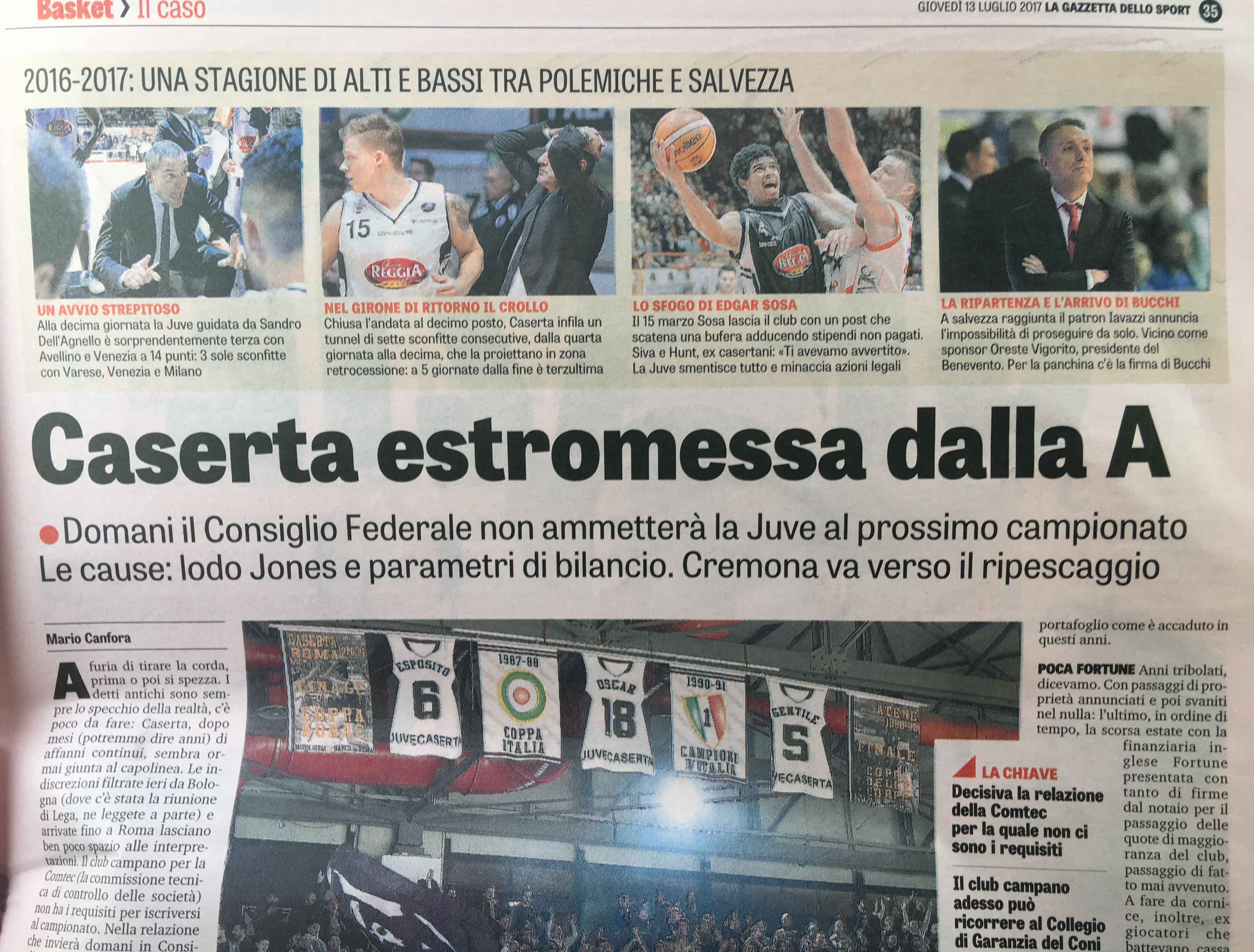 La notizia ha del clamoroso. La Juvecaserta è vicinissima a dire addio alla serie A. Lo riporta la Gazzetta dello Sport oggi in edicola che spiega i motivi di questo incredibile tragedia sportiva. Circa 200 mila euro di debiti (ricavi/indebitamenti/patrimonio netto) e il Bat Fiba non pagato a Bobby Jones hanno fatto scattare l’allarme. La Comtec ha inviato la propria relazione e domani il Consiglio Federale estrometterà i bianconeri dalla massima serie di basket italiano. Il club, che aveva già iniziato la campagna acquisti, potrà ricorrere al Collegio di Garanzia del Coni per provare a restare in vita. Al posto di Caserta si prepara Cremona.